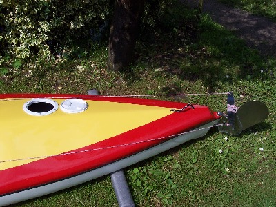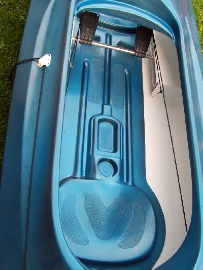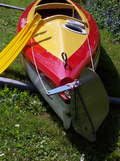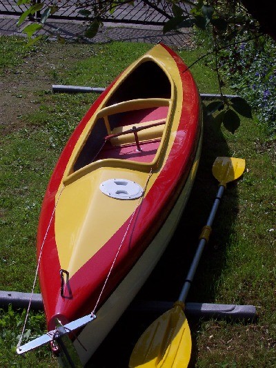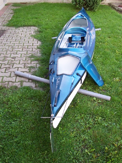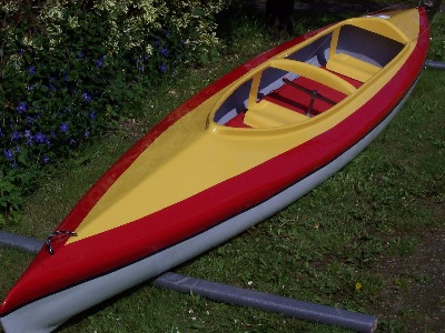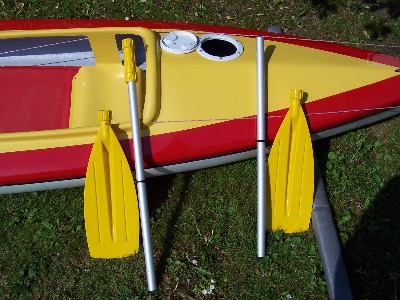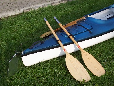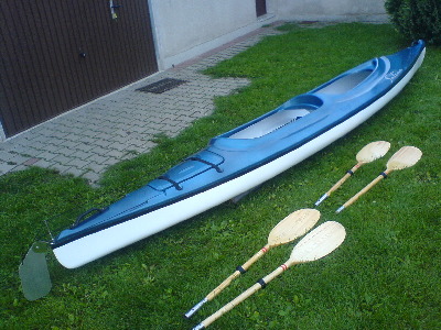 Dieses Zweimannkajak ist 500 cm Lang / 80 cm Breit /40 cm Hoch und hat ein Gewicht von 30 kg .Das Material ist eine Carbonverstärkte Plastik ,dadurch wird das Boot elastischer.Das Steuer ist aus Edelstahl und wird vom hinterem Fahrer durch Pedalen bedient.Desweiteren besitst das Kajak ein geschlossenes Staufach.Die Paddel sind aus Holz und in sich verdrehbar.Das Kajak ist Werksneu und kostet 950 € mit Steuer und Paddeln.