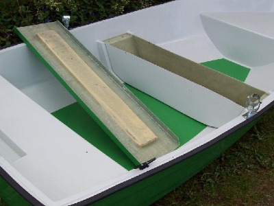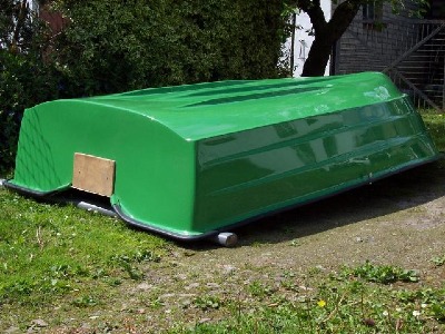 Ruderboot 320 cm lang ,157 cm breit ,Gewicht 47 kg ,Tiefgang vorne 65 cm ,mitte und hinten 40 cm. Das Boot hat einen doppelten Rumpf und ist zusätslich mit zwei Luftkammern versehen,dieses macht das Boot stabieler und läst es nicht untergehen. Wie auf dem Bild zu sehen ,ist es spiegelverstärkt und dadurch motorriesierbar bis 8 PS .Dieses Boot ist durch seine breite gut geeignet zum Angelsport oder einfach als Paddelboot auf Seen und Flußlandschaften. Es können 3 Erwachsene oder 4 bis5 mittelgroße Personen mitfahren. Der Bootskörper ist aus hochwertigem GFK (Glasfaserkunststoof) Material gefertigt. Die 210 cm langen Ruder sind aus verleimtem Holz. Die mittlere Sitzbank läßt sich nach oben abnehmen und ergibt ein etwa 100 cm langes, 30 cm breites und 20 cm tiefes Staufach.Die Ruder können in den Dollen je nach länge verschoben und dann mit einer Schraube arretiert werden,wodurch sie nicht wegfallen können.Weiterhin besitzt das Boot ein Kantenschutzgummi, eine feste Öse am Buck und vier Klampen zum festmachen des Bootes.Preis 700 €